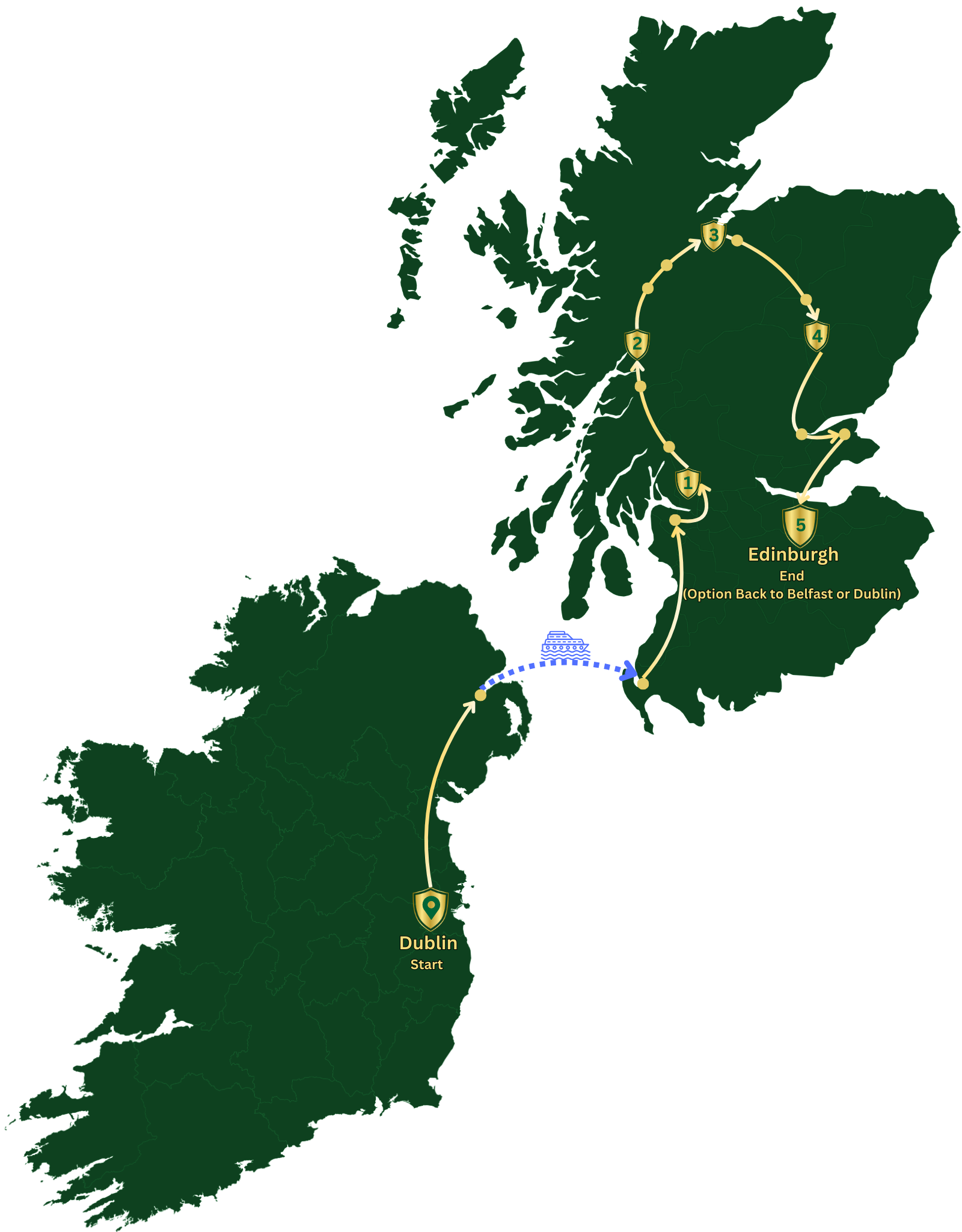 Your adventure starts at Dublin Airport Coach Park 16, where our team welcomes you on board. Settle in as we head north to Belfast, watching Ireland’s gentle hills and villages pass by. At Belfast, step aboard the ferry and cross the Irish Sea, leaving one Celtic land for another—Scotland, where history and legend meet.